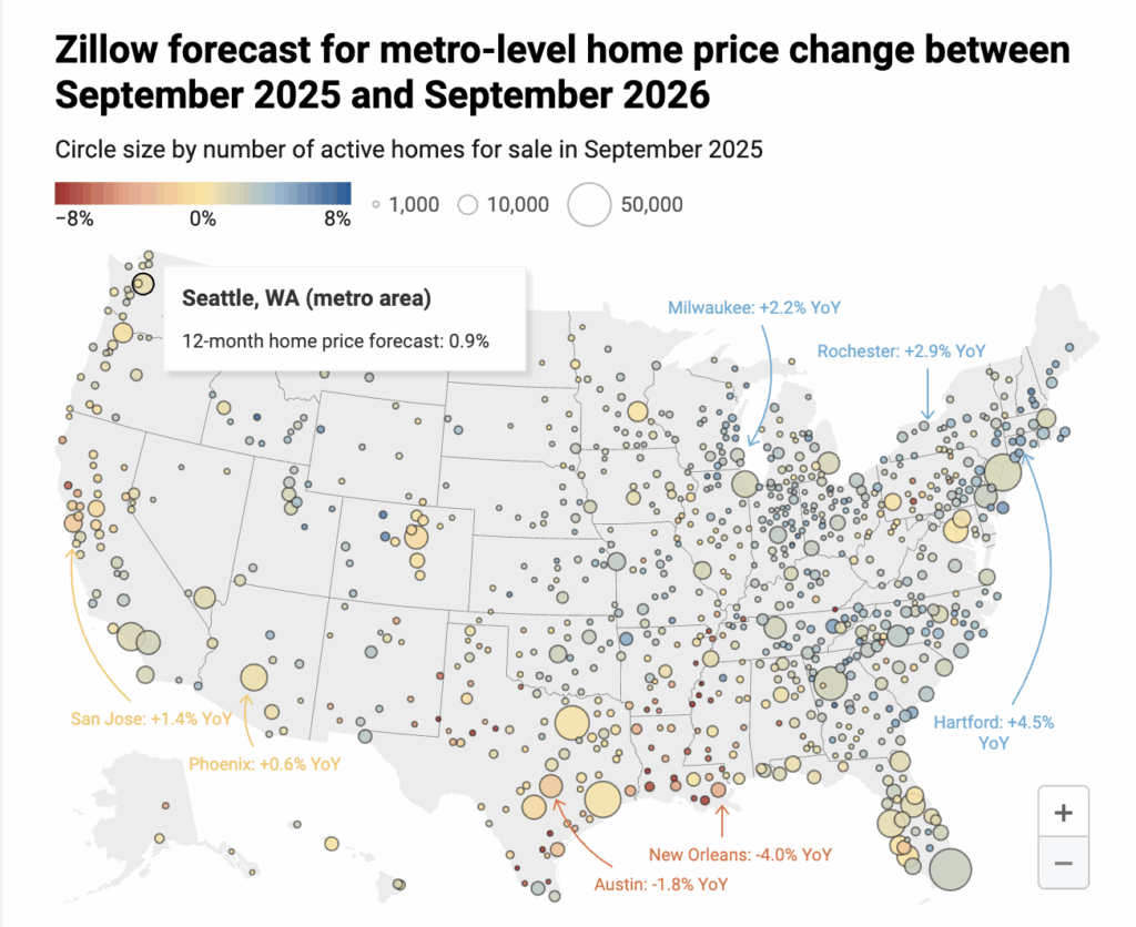 但我必须跟大家泼盆冷水——虽然大趋势是降息,房子长期也是抗通胀的好东西,但现在绝对不是让你闭着眼睛随便买的时候!现在西雅图市场分化特别明显,有些区域、有些类型的房子,价格其实已经偏高了,盲目入手很容易烂在手里;但也有不少区域和户型,价格很合理,甚至还有捡漏空间。哪些该买、哪些要避坑,我会在后面的实操建议里给大家讲得一下,大家一定要看到最后!