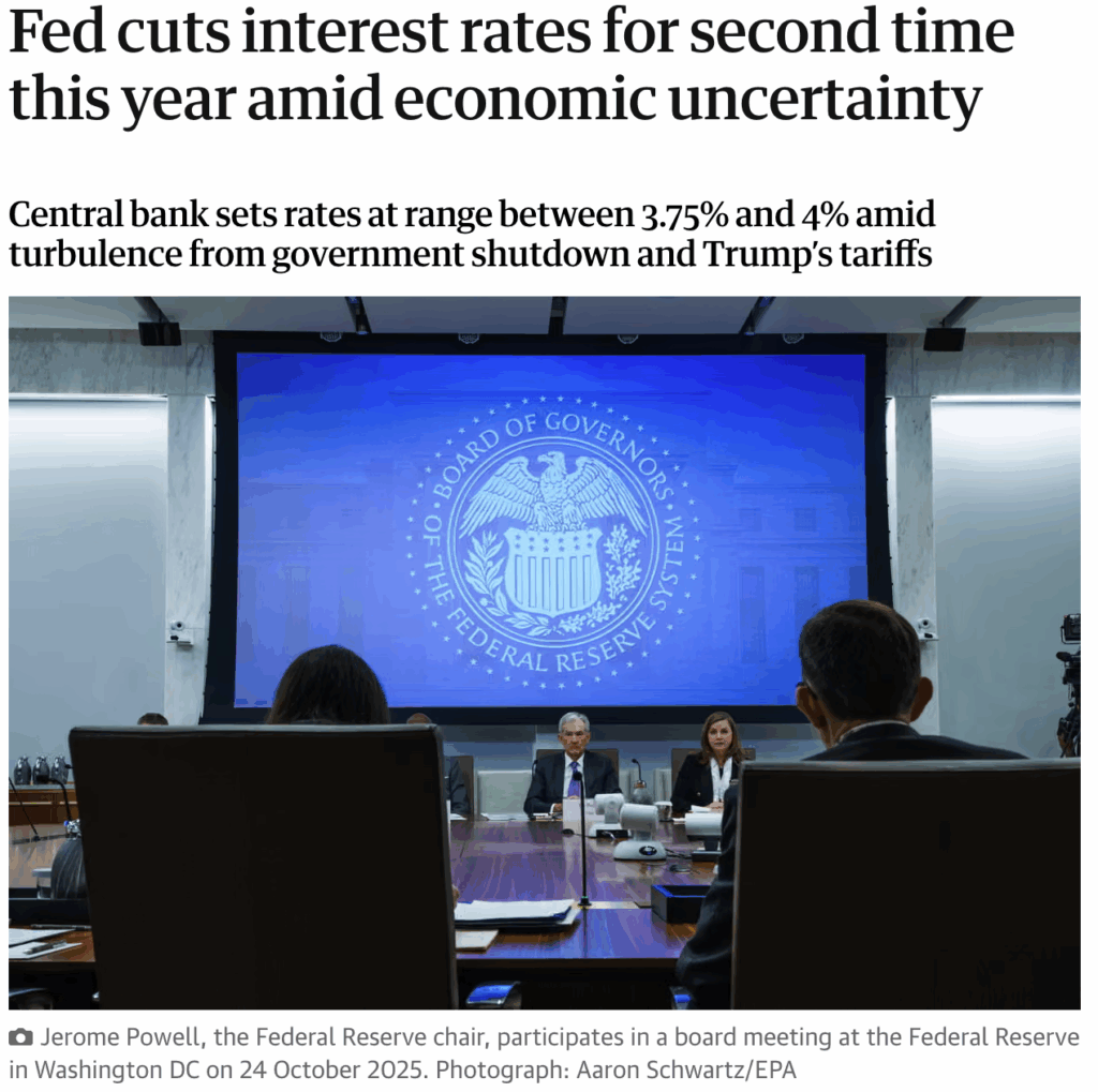 先看大家最关心的利率——10月29号美联储又降了25个基点,这是今年第二轮降息,现在基准利率3.75%-4.00%!其实这点我们前两期市场报告就预判到了,当时就说鲍威尔敢降息,唯一合理的理由就是通胀真的下来了。果不其然,降息后他在发布会就明确表态,这次降息完全是对通胀回落的合理回应,还嘴硬说“不会盲目开启降息周期”,要根据数据灵活调整。