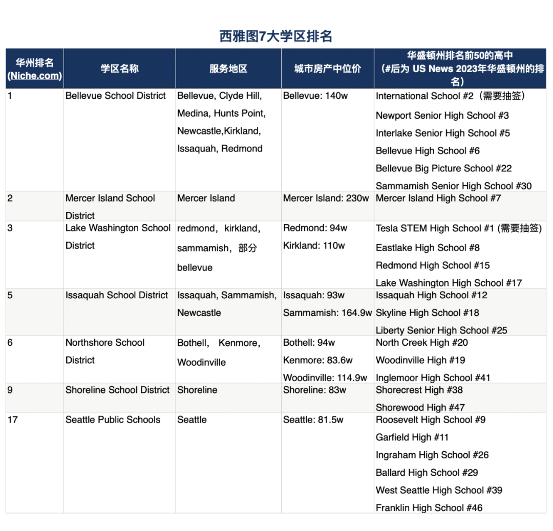 这篇文章我想聊一下大西雅图地区的学区(不包括Bainbridge Island,Tacoma,Everett等比较远的地区)主要可以分为7个学区,我们根据niche这个网站的排名先后进行介绍,分别是Bellevue 学区、Mercer Island 学区、Lake Washington 学区、Issaquah 学区、Northshore 学区、Shoreline 学区 、Seattle 学区(下面是结果学区的基本资料和排名,文章最后还有各个学区的边界地图,大家可以保存):