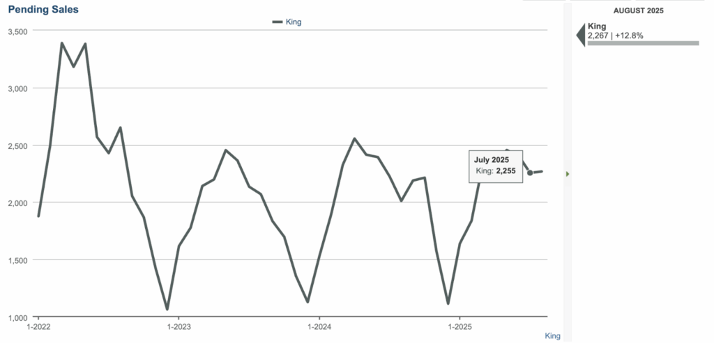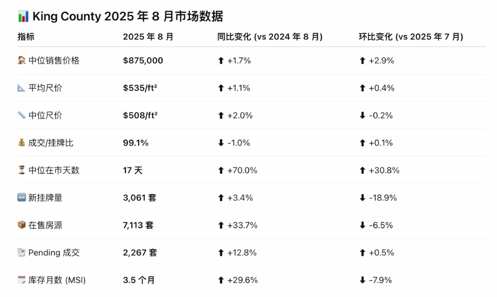 短期来看( 3–6 个月),降息会刺激一部分买家,成交量短期会有所回升。这点在 King County 8 月的数据里已经看到了,Pending 同比增加了 13%。