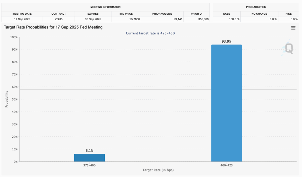 根据 CME FedWatch 的数据,9 月 17 号美联储降息的概率已经超过 93%,其中大部分押注是降 25 个基点,还有小部分人押注一次性降 50 个基点。换句话说,市场几乎认定降息是板上钉钉的事了。
