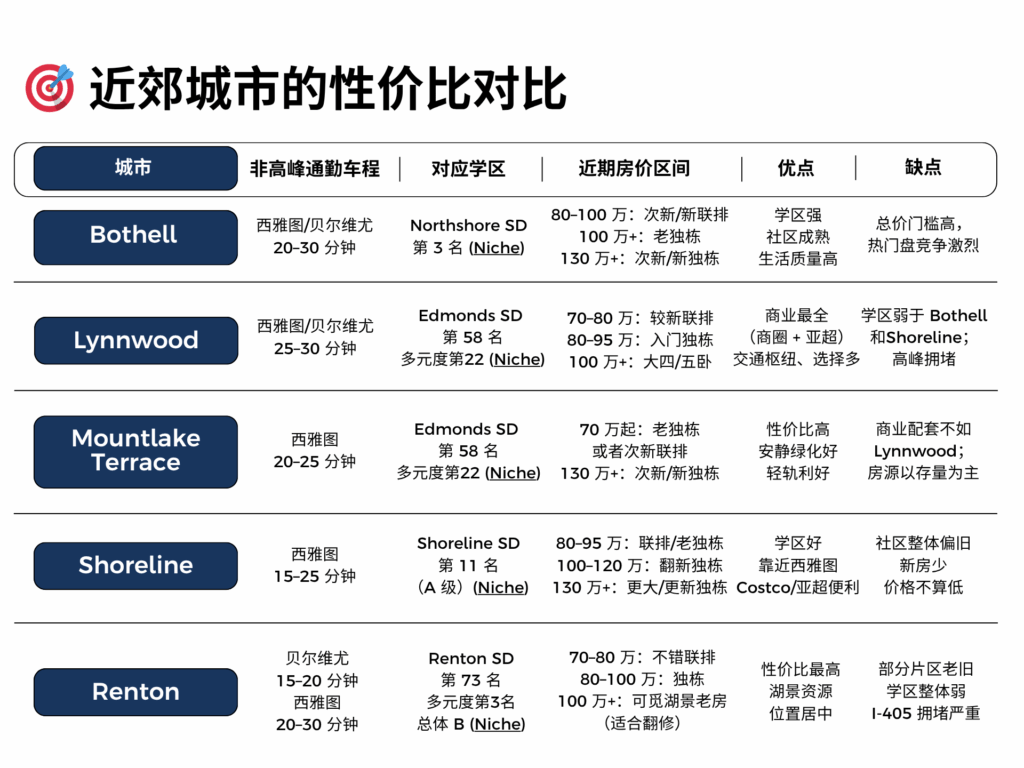 今天我们一起看了 Bothell、Lynnwood、Mountlake Terrace、Shoreline 和 Renton 这五个城市。每个地方都有它的优点,也都有不足。为了方便大家对比,我也整理了一张表格,把通勤时间、学区排名、房价区间、优缺点都放在里面。