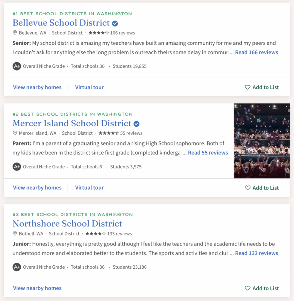 根据最新的 Niche.com 排名,Northshore 学区在整个华盛顿州排到了第三名,仅次于 Bellevue 和 Mercer Island,甚至超过了大家非常熟悉的 Lake Washington 学区。这里有几所特别有名的学校,比如 Bothell High School 和 Inglemoor High School,学术成绩都很出色,在全州家长心目中都非常有口碑。