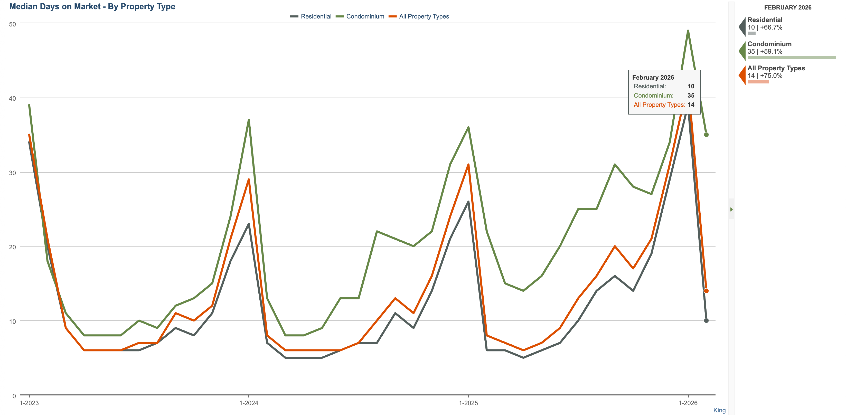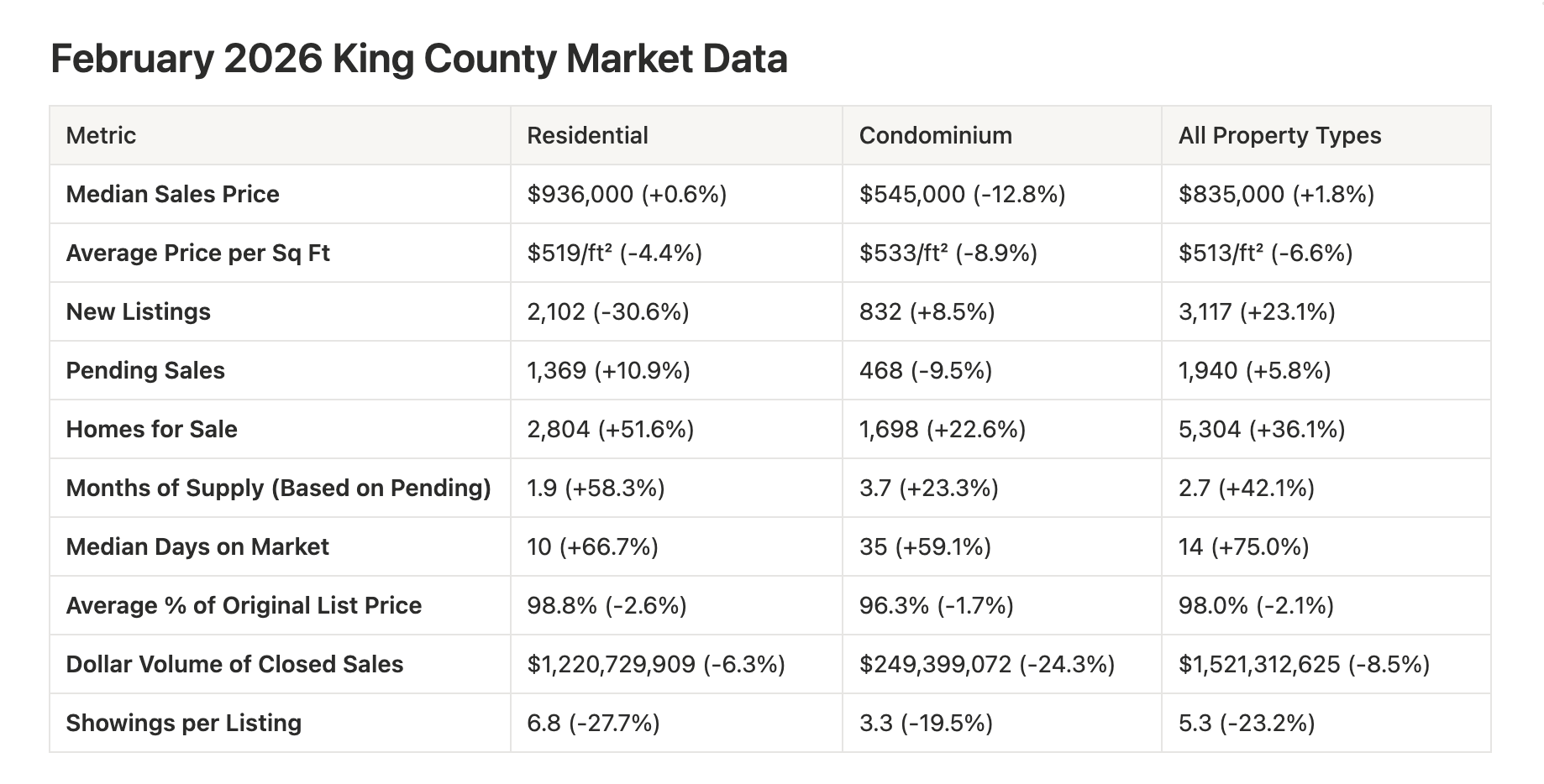 - NWMLS Housing Data (King County 2026年2月市场报告,包括中位价$840k、库存增35.5%):