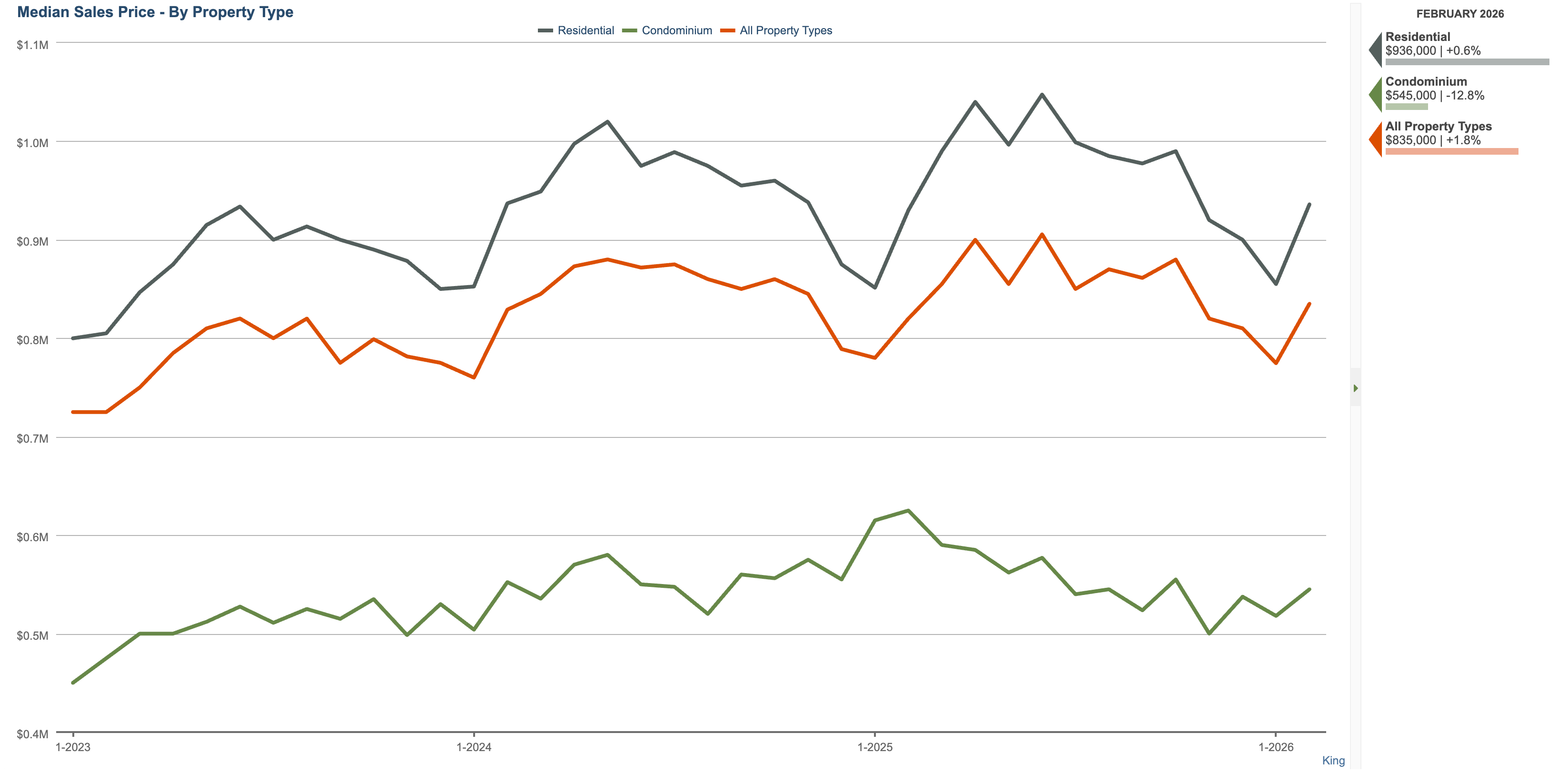 根据 NWMLS 数据,2026年2月 King County 房屋成交中位价为 835,000 美元,同比上涨约 1.8%。如果只看整体房价,这似乎意味着市场仍然保持稳定,但当数据细分到不同房屋类型时,差异就变得非常明显。