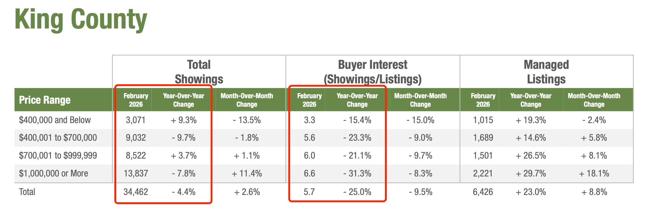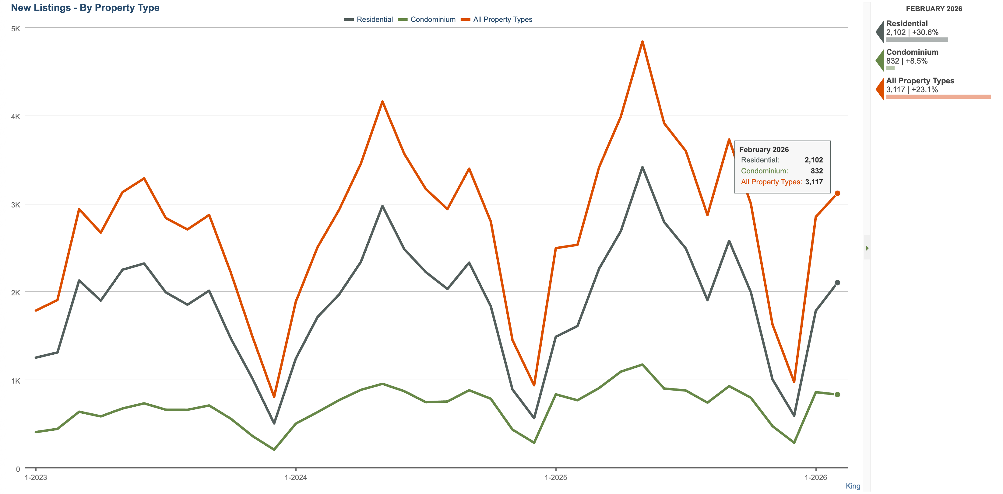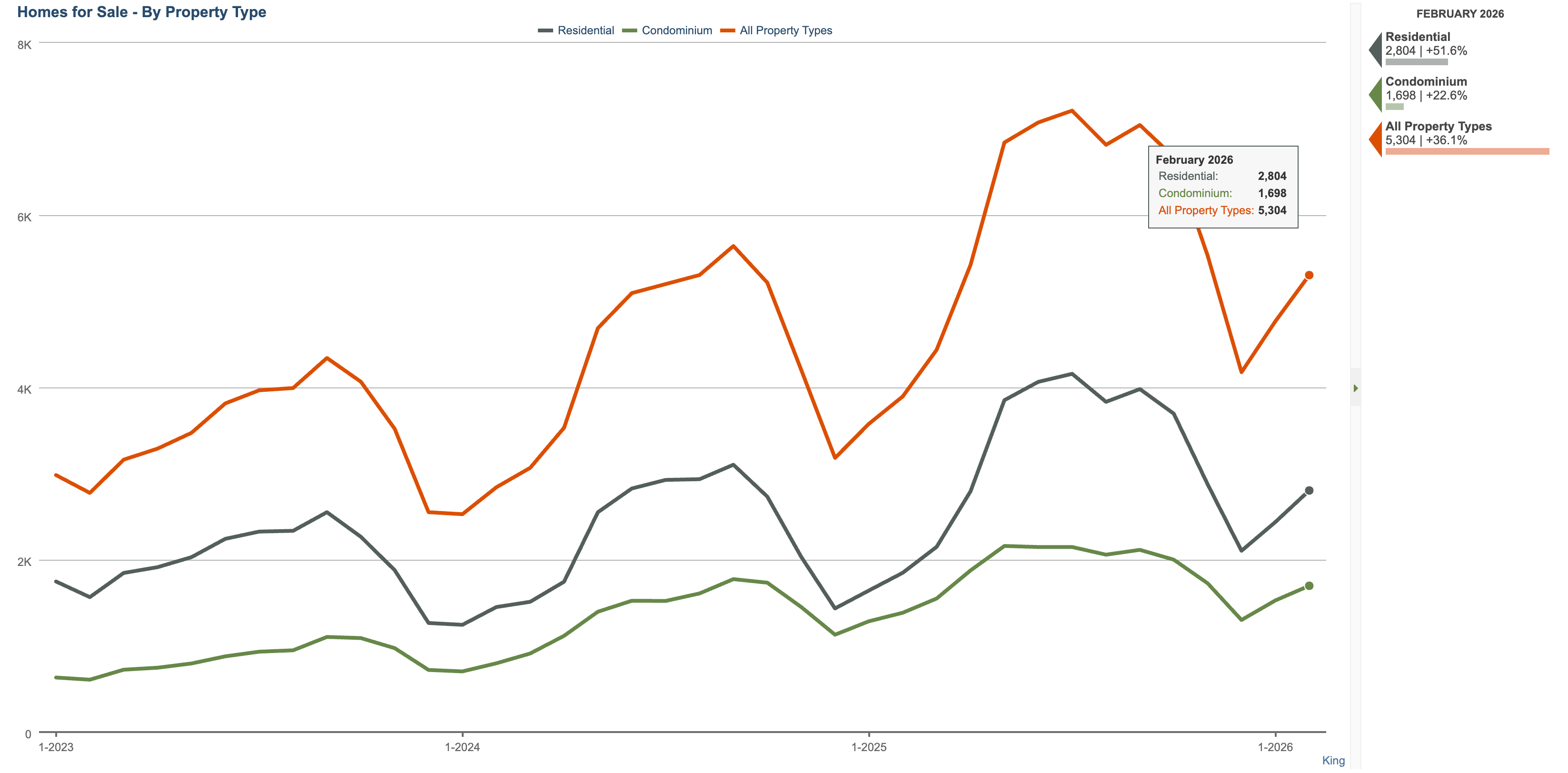 根据 NWMLS 数据,2026年2月 新上市房源同比增长约23%,在售房源数量也出现明显增长。这意味着买家在市场上拥有更多选择,同时卖家之间的竞争也在增加。
