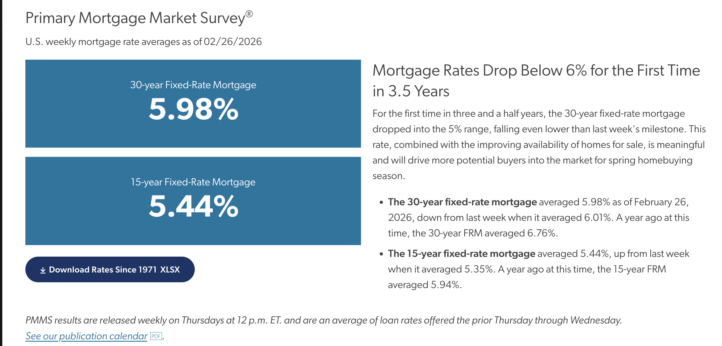 根据 Freddie Mac 数据,截至 2026年2月26日,美国30年固定房贷利率降至 5.98%,这是三年半以来首次跌破6%。
