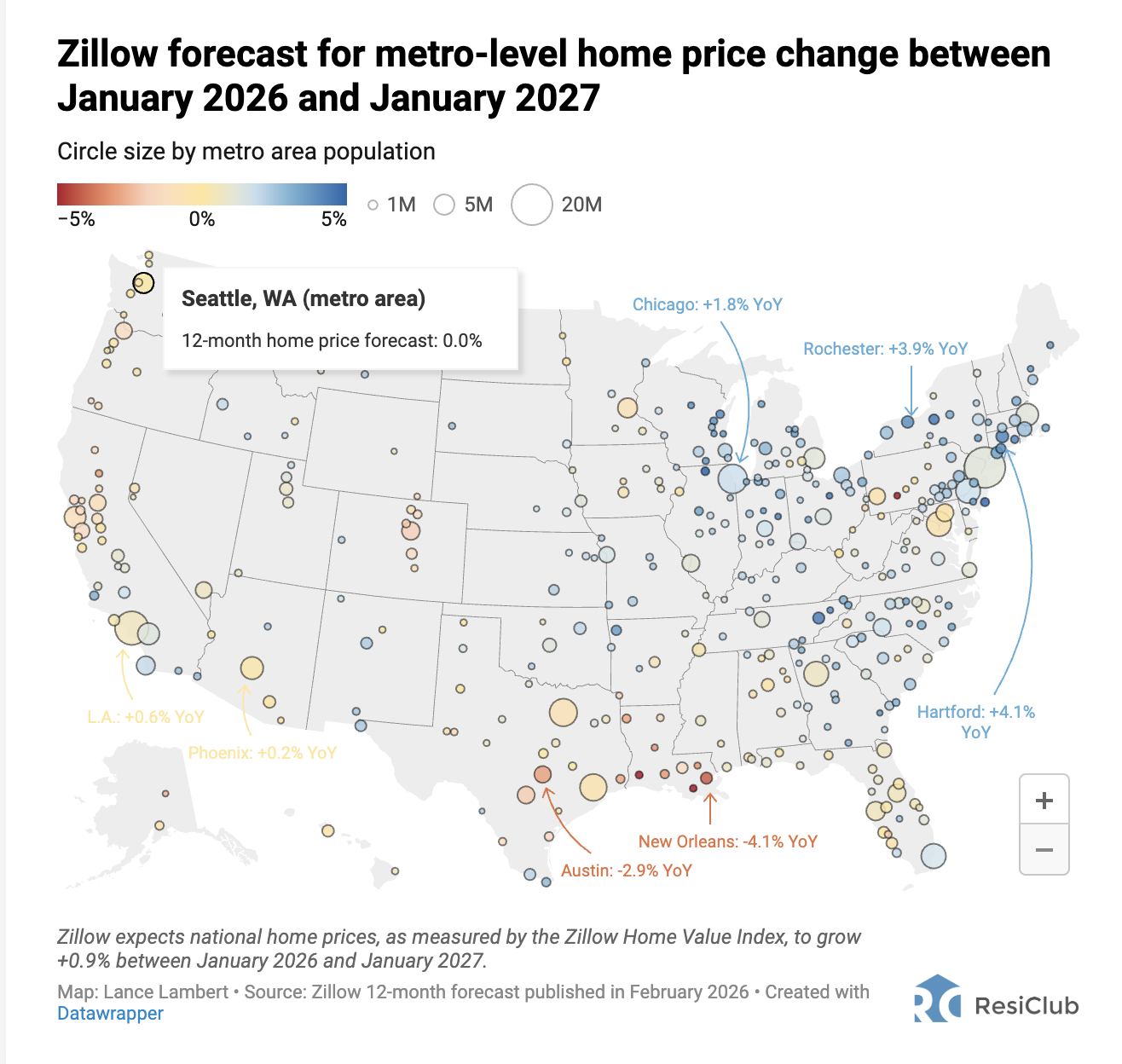 根据 Zillow Research 的预测,2026年西雅图房价整体涨幅接近零,市场更可能维持相对稳定状态。这意味着未来一年西雅图房地产市场更可能表现为 价格小幅波动,而不是明显上涨或下跌。
