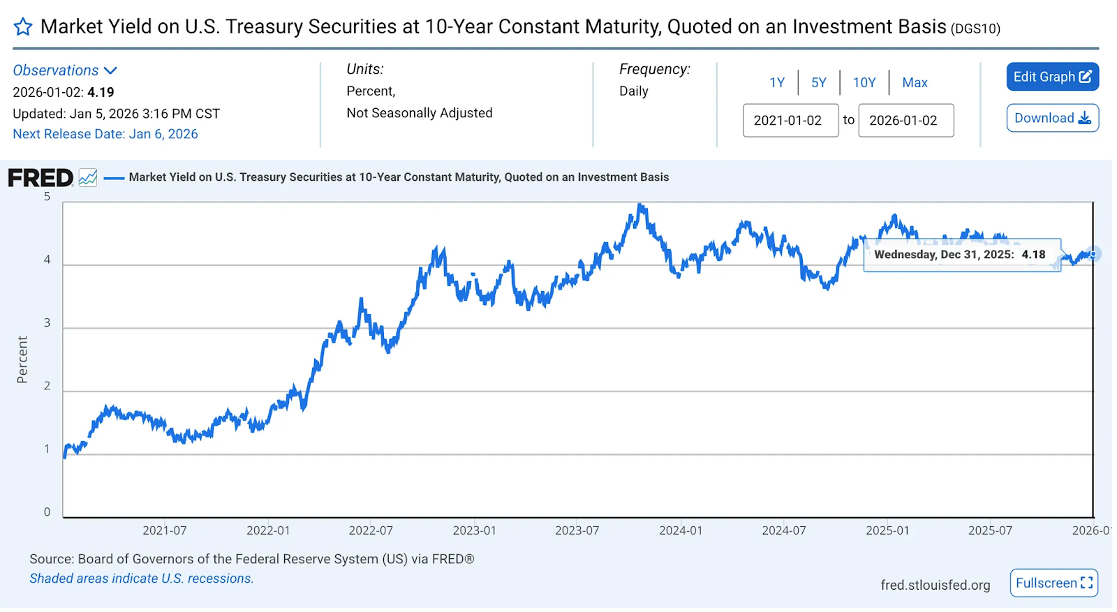 行政当局对降息的公开施压会导致10年期美债收益率(房贷利率的锚)出现非理性波动。购房者应学会与6%左右的利率长期共存,而非等待重返4%的幻象。房贷利率的长期走势并非由房地产市场单独决定,而是由长期国债收益率主导。10 年期美国国债收益率,正是房贷利率最重要的定价锚点。