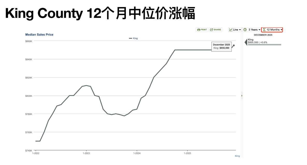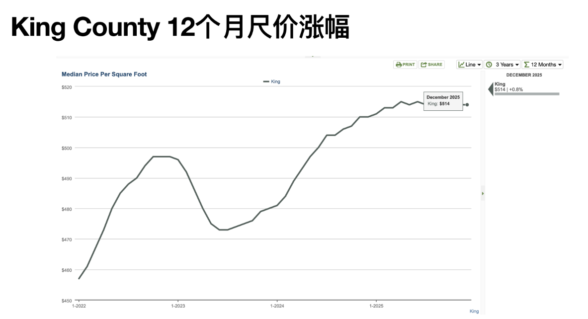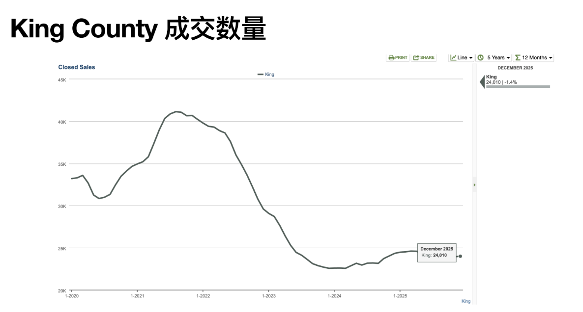根据NWMLS数据,金县(King County)的活跃房源量在2025年底同比增加。这意味着买家不再面临“无房可买”的焦虑,FOMO(错失恐惧)情绪已被极致的财务理性取代。