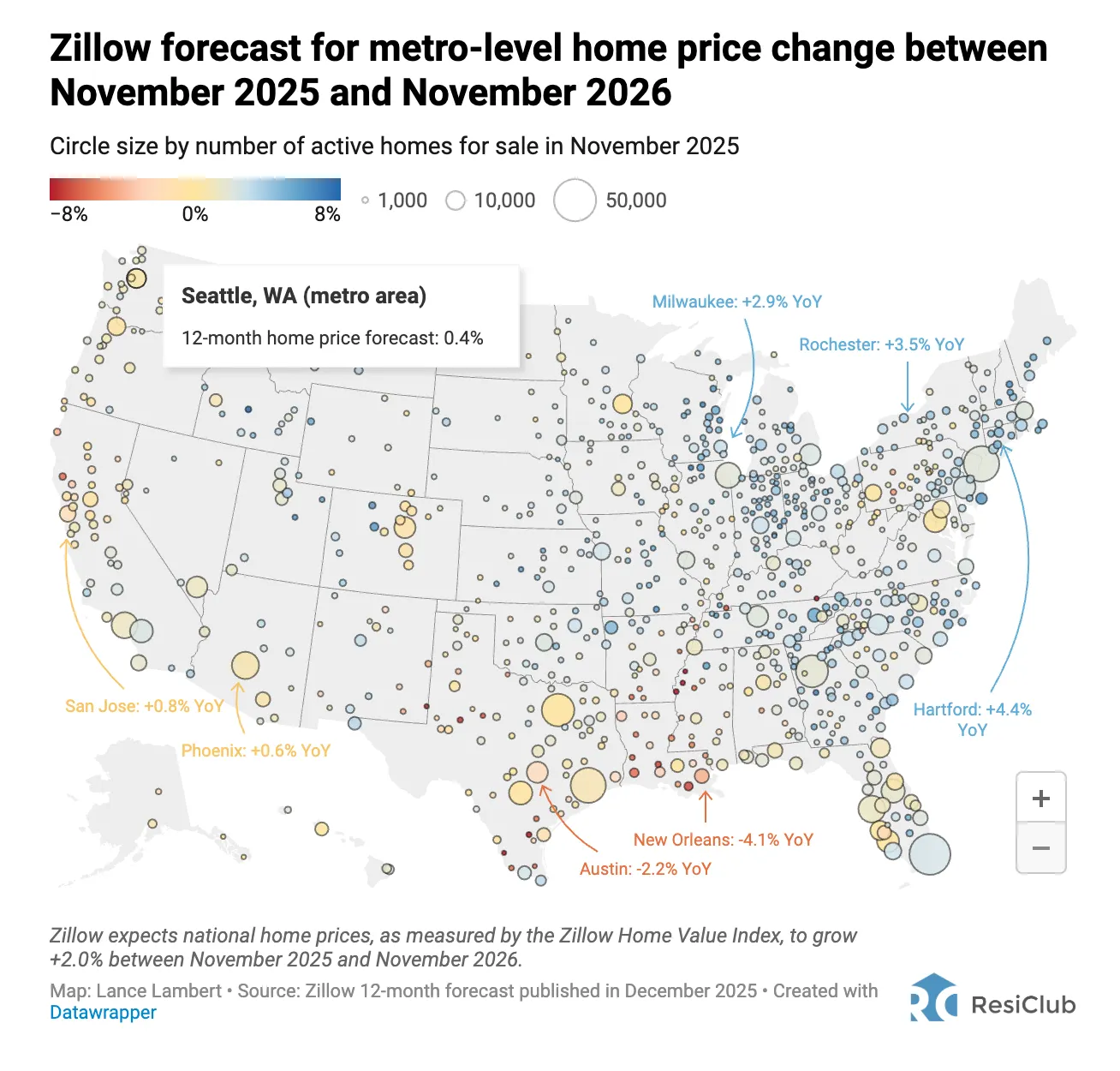 数据来源:Zillow 2026 Housing Market Forecast。西雅图都会区涨幅明显低于全国平均水平,符合横盘与区域分化判断。